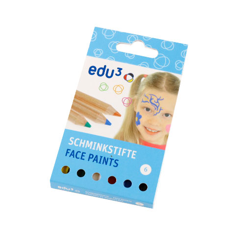 edu³ Schminkstifte sind für feine Konturen und größere Flächen geeignet. Die Farbe ist dermatologisch getestet und einfach entfernbar. In diesem Set finden Sie je einen Stift in gelb, rot, grün, blau, schwarz und weiß.