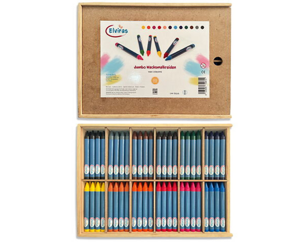 Schöne Holzbox mit 144 ELVIRAS Jumbo Wachsmalern in 12 satten Farben. Diese Wachsmaler haben einen besonders weichen Abrieb und sind bruchfest.