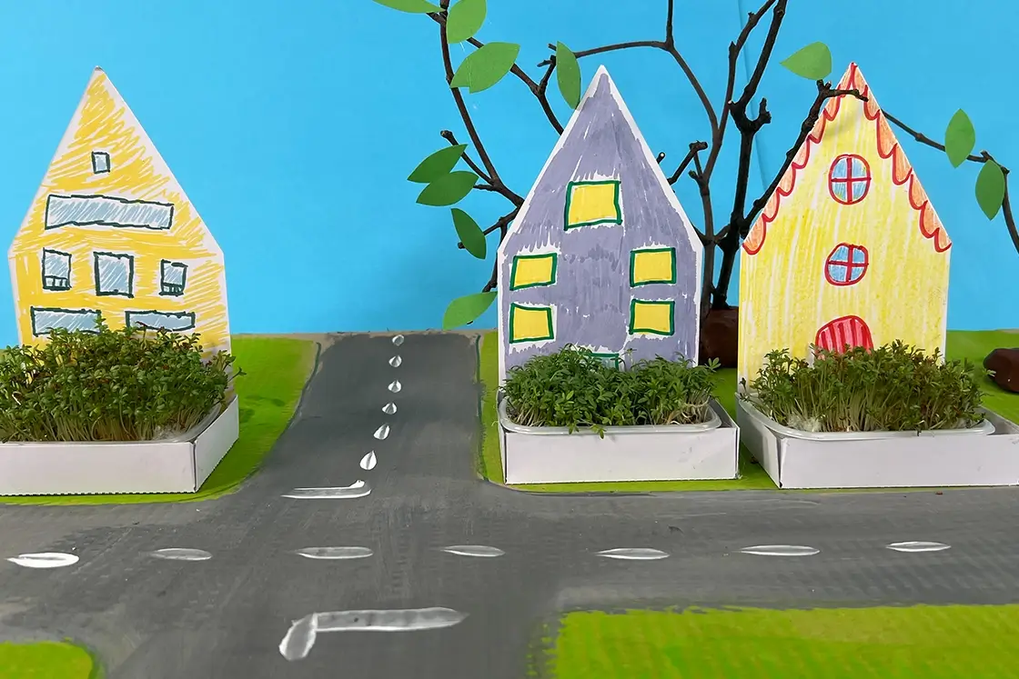 Für unsere Kressestadt gestaltet jedes Kind sein eigenes kleines Kressehaus – und zusammen entsteht eine grüne Stadt, die wächst und lebt.