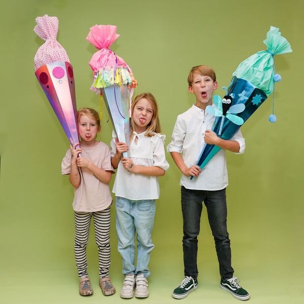 Mit einer glänzenden Schultüte im Arm lassen sich am ersten Tag mit einer Portion Glanz gleich viel leichter Freunde finden.