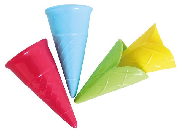 Set aus 4 Eistüten und einem Eisportionierer. Die Eistüten gibt es in zwei unterschiedlichen Formen. Der Eisportionierer ist mit einem Smiley-Gesicht versehen.