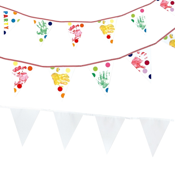 Zwei Wimpelketten zum Bemalen, Bekleben und Verzieren für das Gartenfest, den Kindergeburtstag oder Hochzeiten. Die Wimpelkette kann mit einem Namen beschrieben werden oder wird farbig gestaltet. Der Fantasie sind keine Grenzen gesetzt.